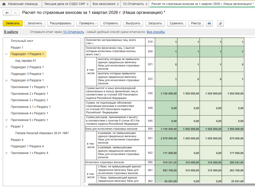 В этом случае Раздел 1 заполняется в одном экземпляре, а подразделы 1.1 и подразделы 1.2 формируются отдельно для каждого кода тарифа. Сумма всех взносов по разным тарифам должна совпадать с общим итогом в Разделе 3 по всем сотрудникам.