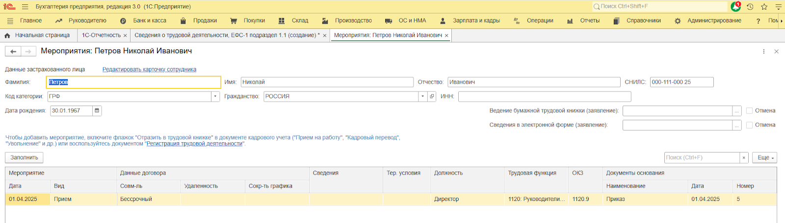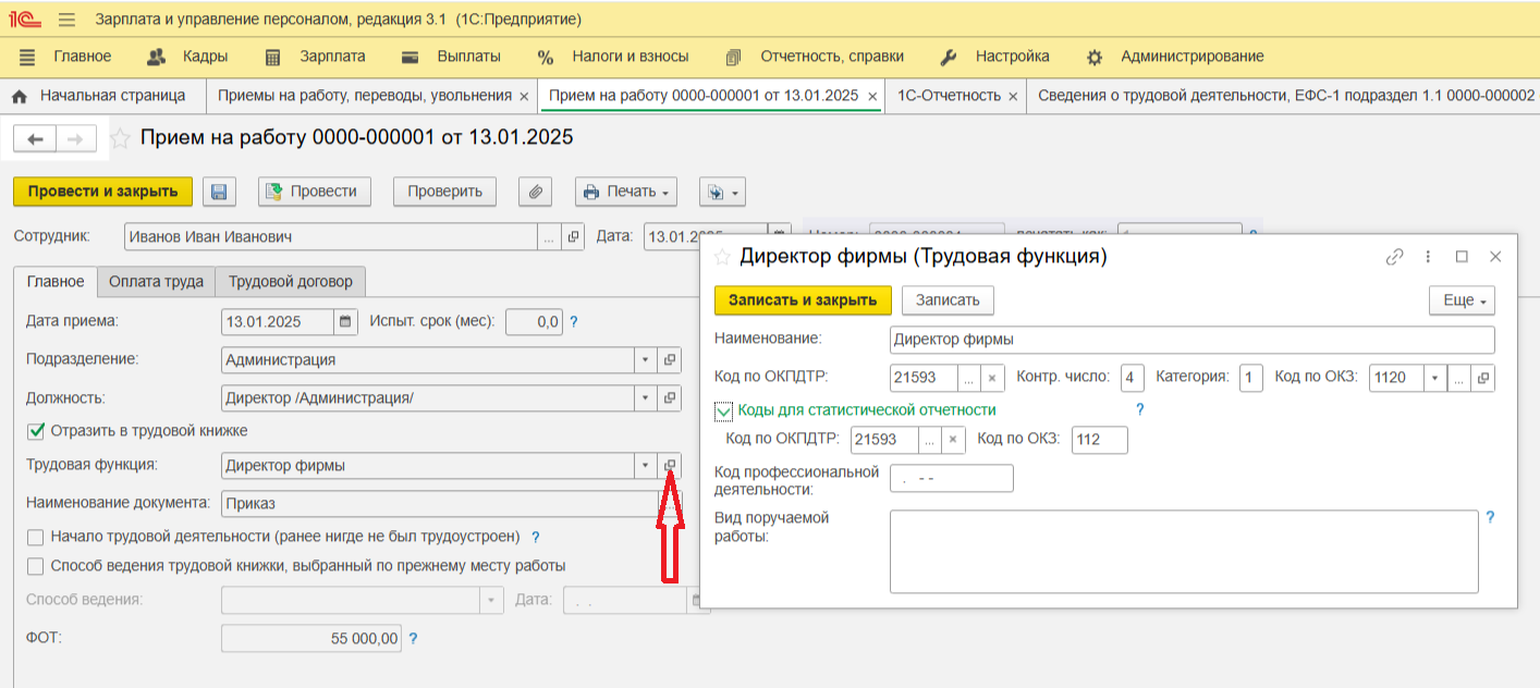 С момента образования СФР вместо СЗВ–ТД появился единый отчет ЕФС–1, в котором подраздел 1.1 взял на себя функции старой формы. В новом отчете бывший «код профессиональной деятельности» теперь называется «код выполняемой функции» (код ОКЗ). Он также указывает на главные обязанности сотрудника. Поэтому сейчас важно указать именно код ОКЗ, а не код проф. деятельности (хотя в кадровых документах поле под него есть). Потому что именно он попадает в отчет ЕФС–1.