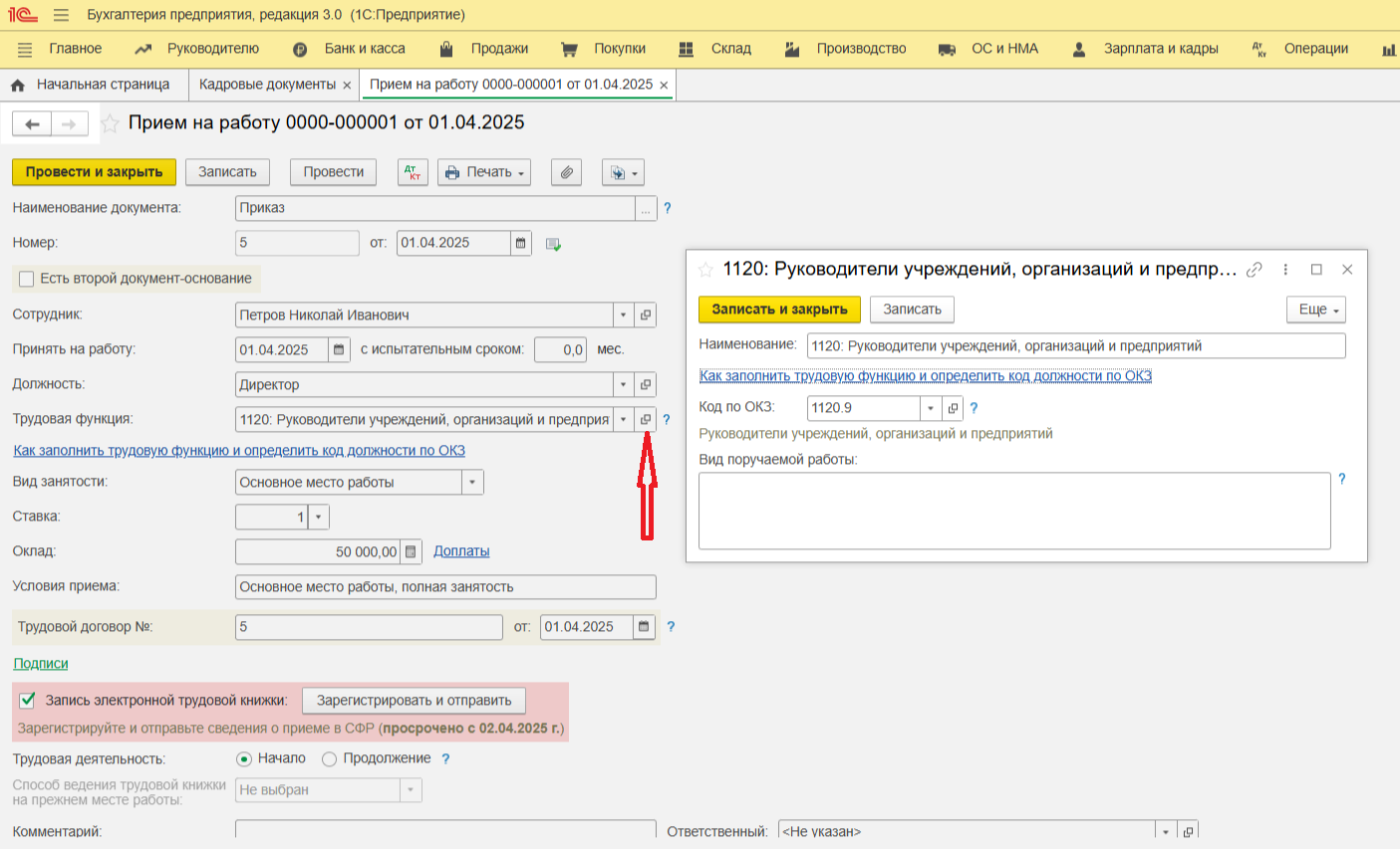 Код заполняется при создании документа «СЗВ-ТД» в 1С: Зарплата и управление персоналом и 1С: Бухгалтерия. Создайте документ на основе кадрового мероприятия, опуститесь в поле «Трудовая функция», создайте запись и введите кодовое обозначение. Подробнее о том, как правильно заполнять код, читайте в нашей инструкции