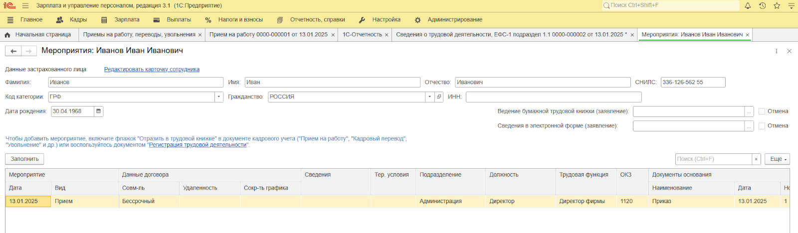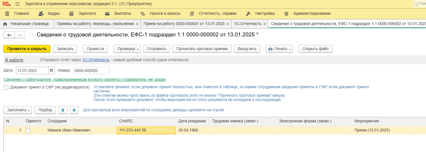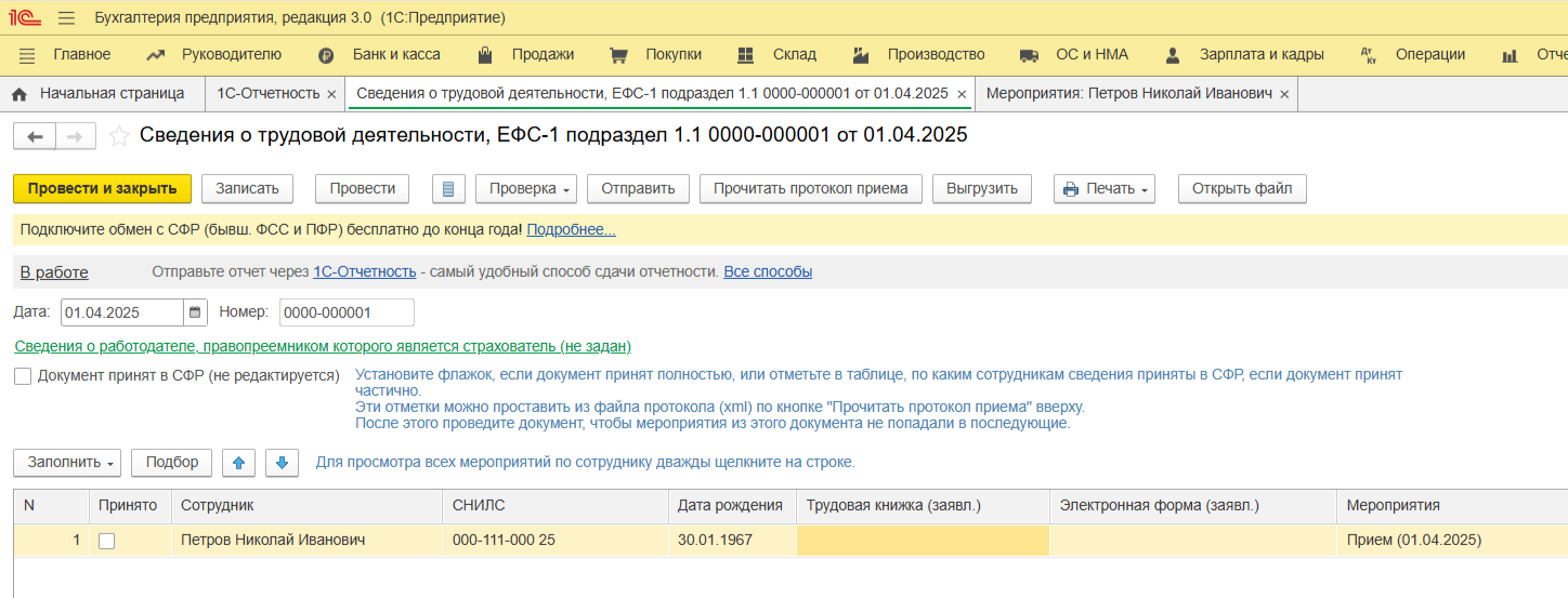 Раздел 1 ЕФС-1, который заменит отчёт СЗВ-ТД, формируется из прежнего документа «СЗВ-ТД». Там же заполняется код трудовой функции. Чтобы выгрузить отчёт по форме ЕФС-1, укажите период не раньше января 2023 года и выберите новую форму. Читайте подробнее о том, как выгрузить документ в новом формате в 1С:БП 3.0 и 1С:ЗУП 3.1.