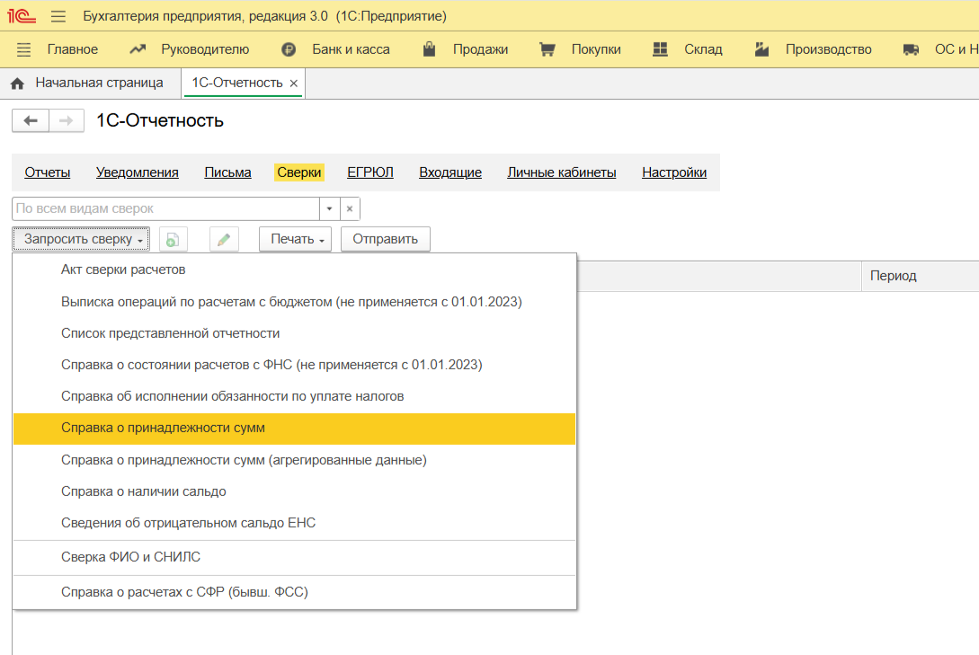 Шаг 2. Формирование запроса. Перейдите в раздел «1С-Отчетность», выберите вкладку «Сверки» и нажмите кнопку создания нового документа. Здесь важно разобраться, как запросить сверку правильно. Выберите нужный период и вид справки: