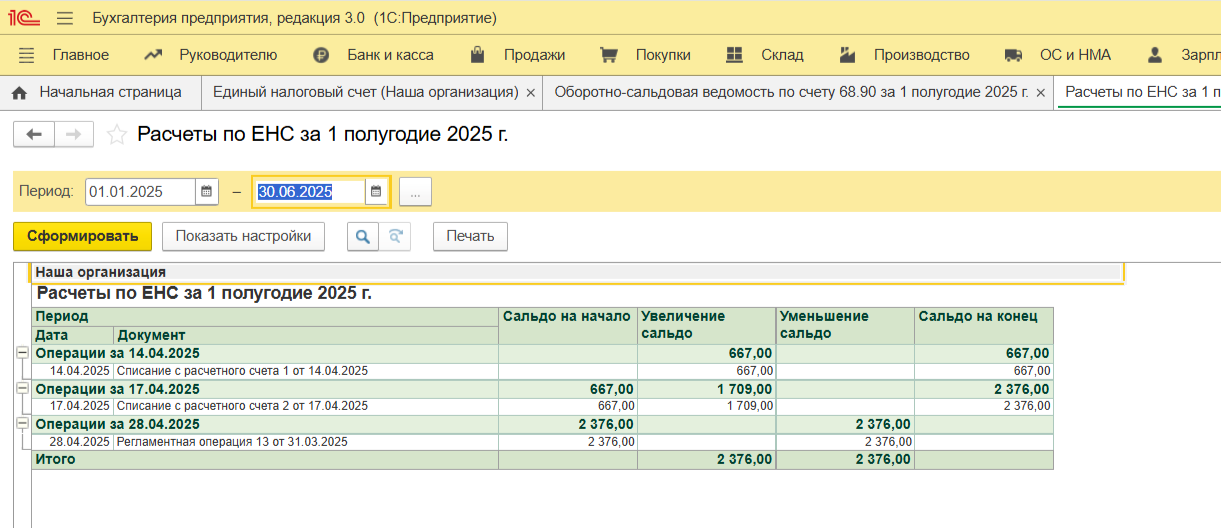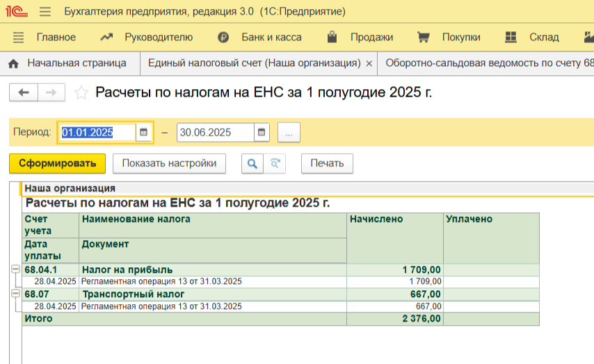 расчеты по налогам на ЕНС: показывает распределение по каждому налогу.