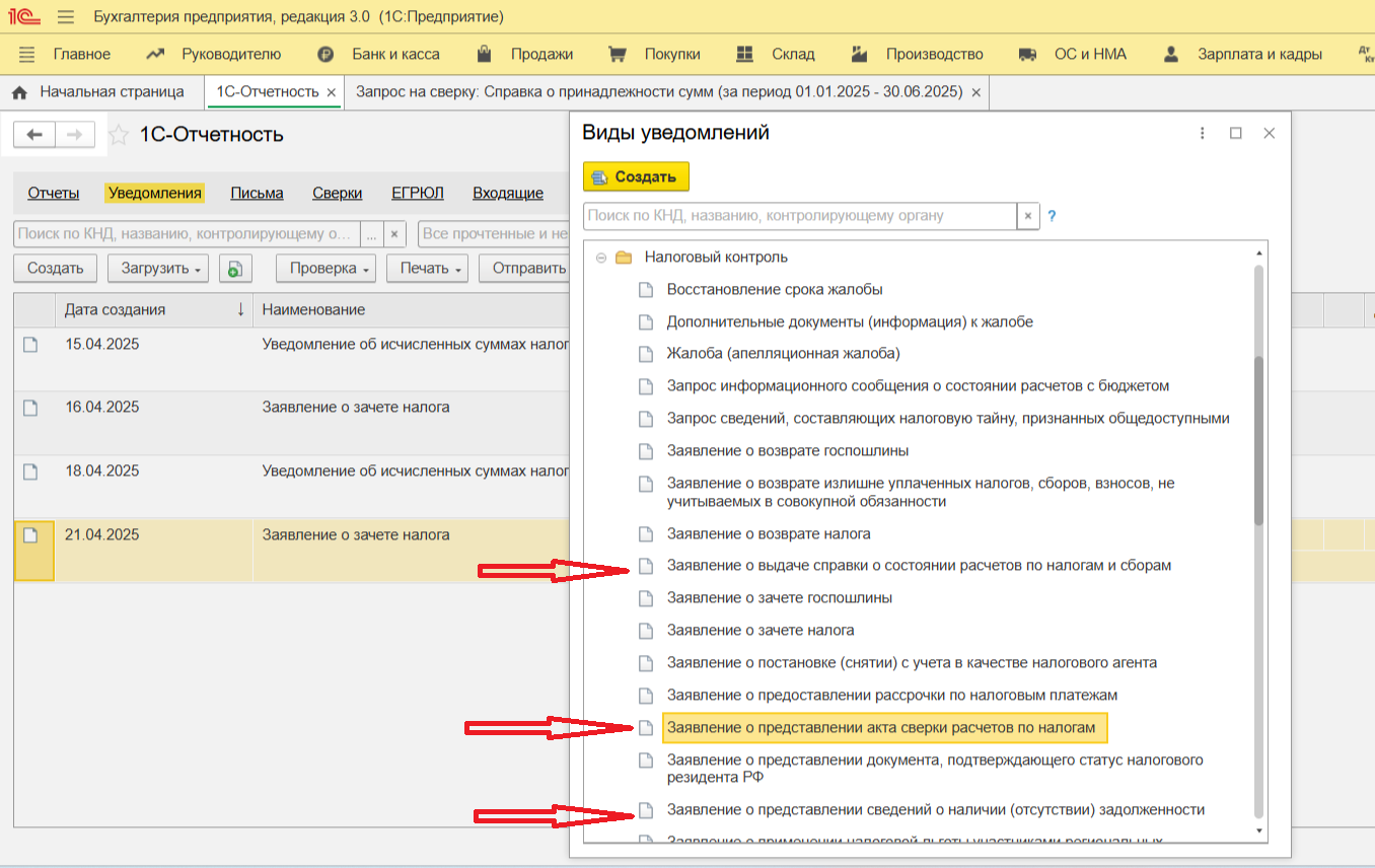 Если же вы не пользуетесь 1С–Отчетность, подайте нужное заявление (раздел «Отчеты» — 1С-Отчетность — Уведомления — Создать — Налоговый контроль) в налоговую самостоятельно.
