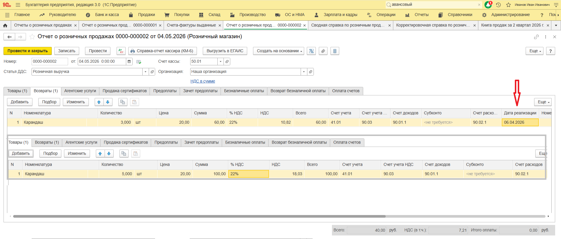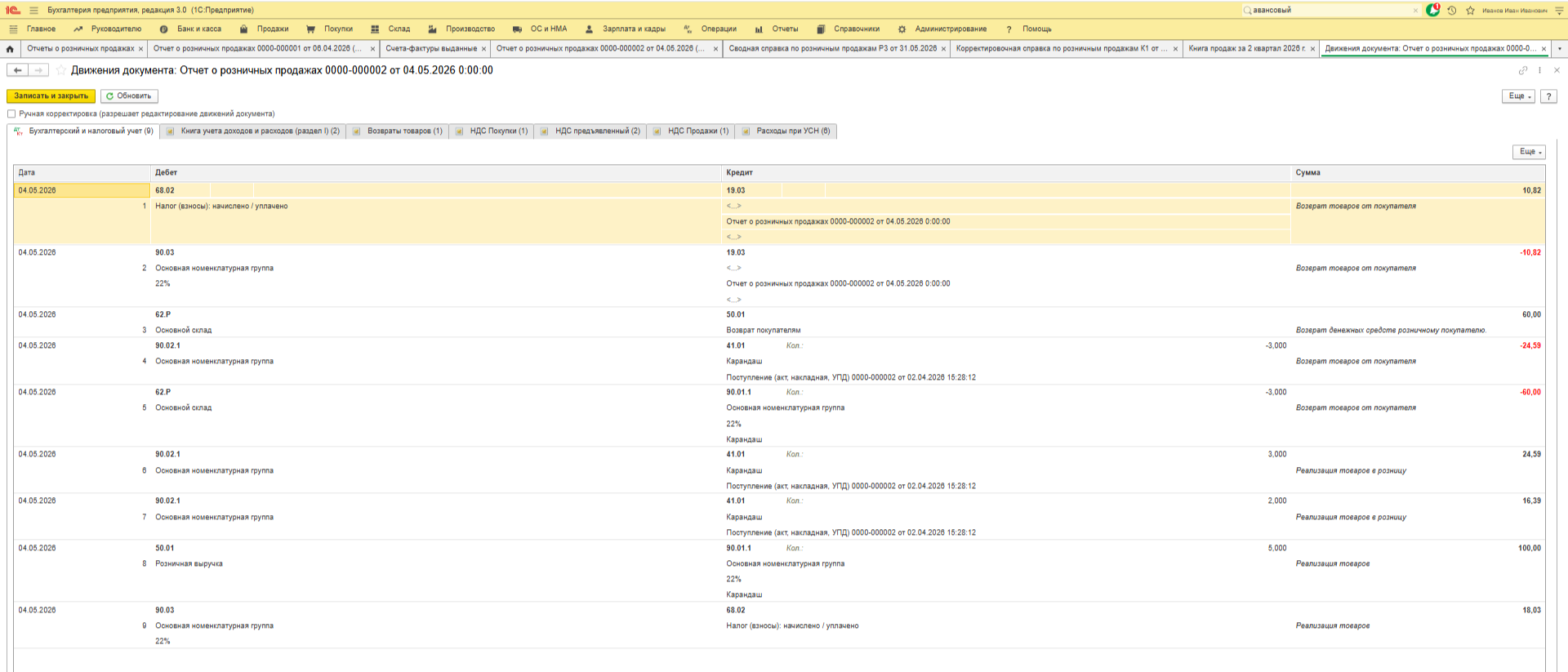 В следующем месяце в один из дней, помимо продаж, по одному из «Отчетов…» прошлого месяца происходит возврат. Обязательно на вкладке «Возвраты» проставьте дату продажи возвращаемого товара. Документ формирует проводки.