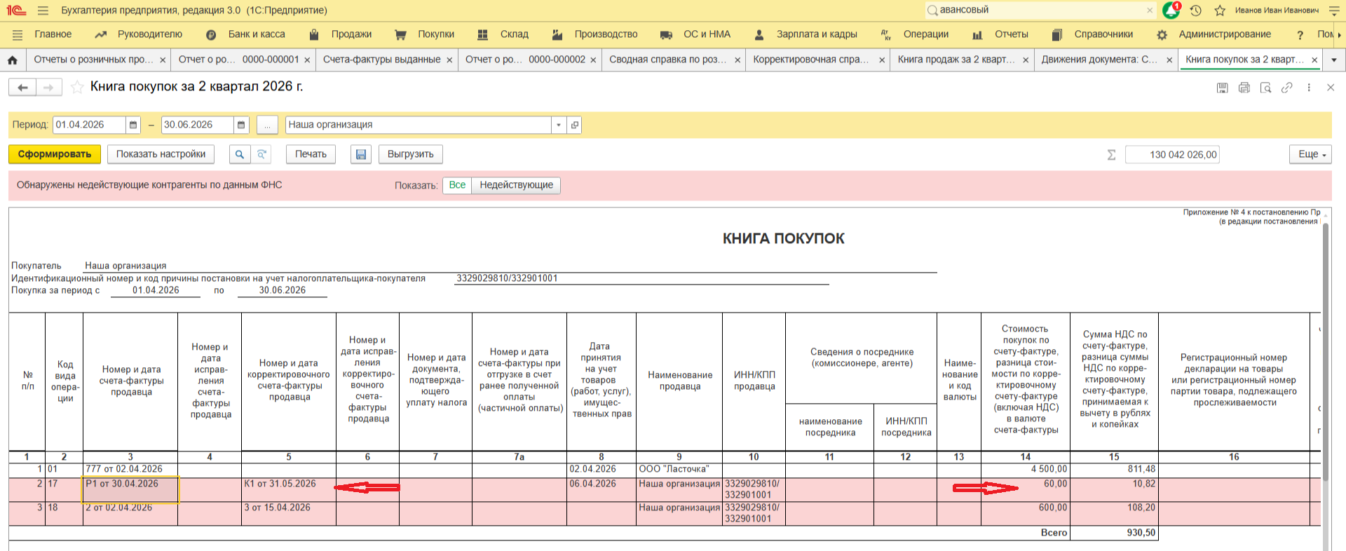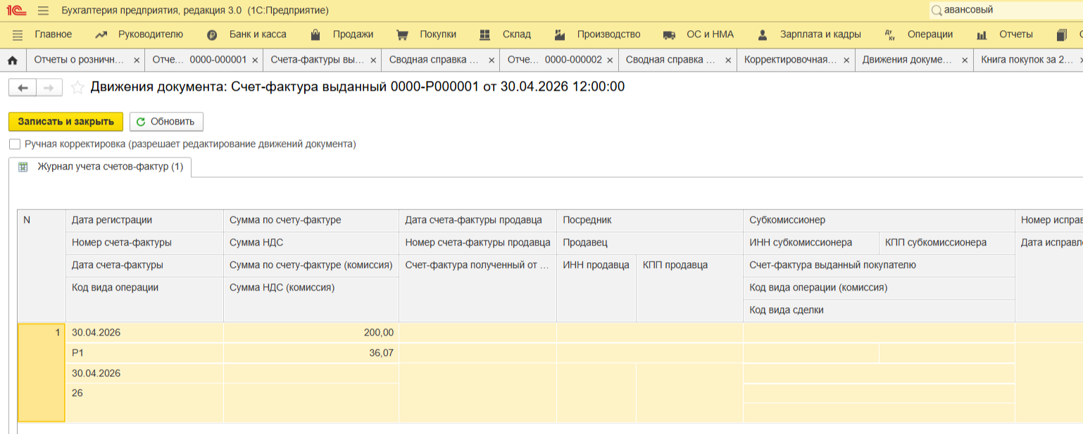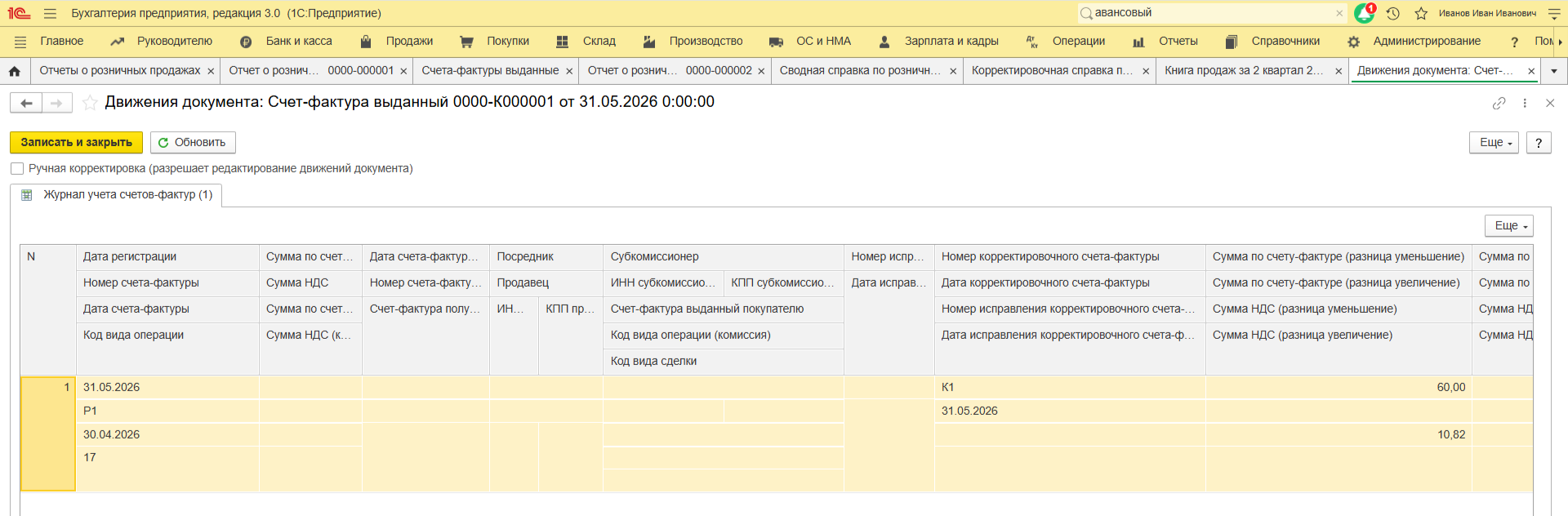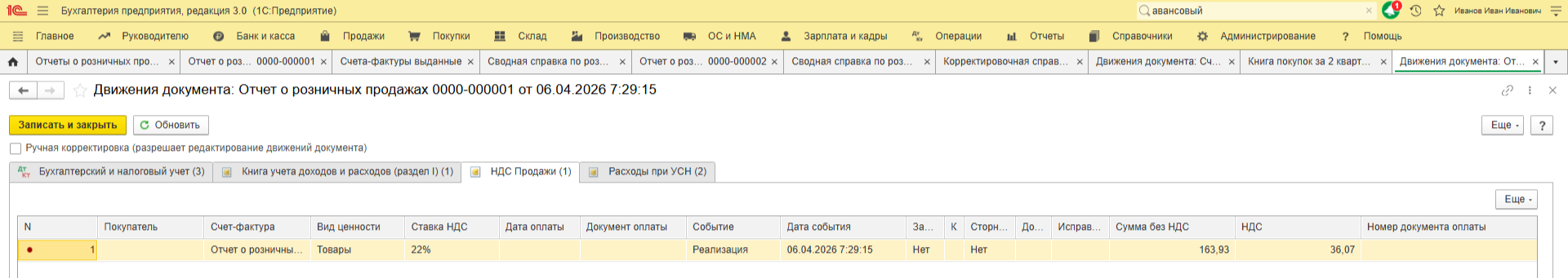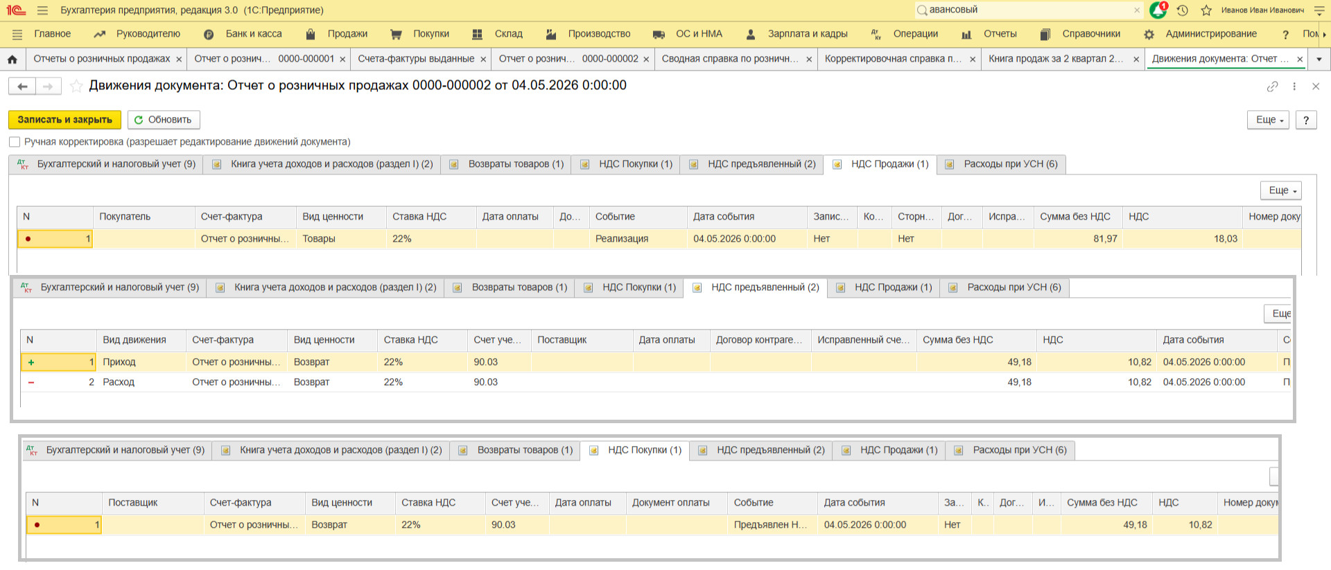 Также документ формирует запись для Книги продаж (вкладка «НДС продажи»), данные о возврате («НДС предъявленный»), а на вкладке «НДС покупки» — данные по возврату для Книги покупок.