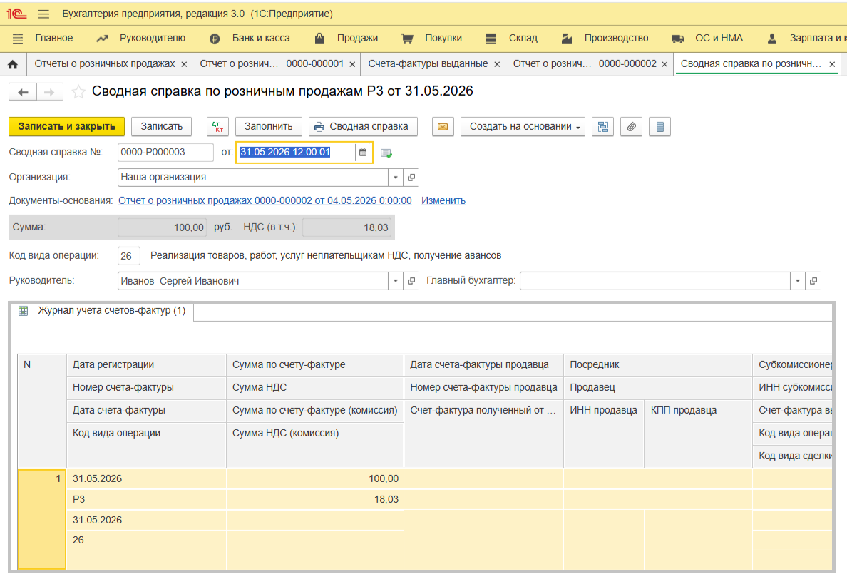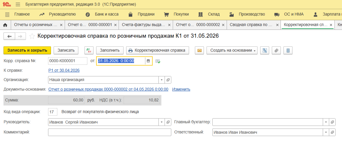 Поскольку был возврат, в этом же месяце нужно сделать Корректировочную справку по розничным продажам, которая фиксирует запись для Книги покупок. Делается такая справка там же, где и обычная сводная
