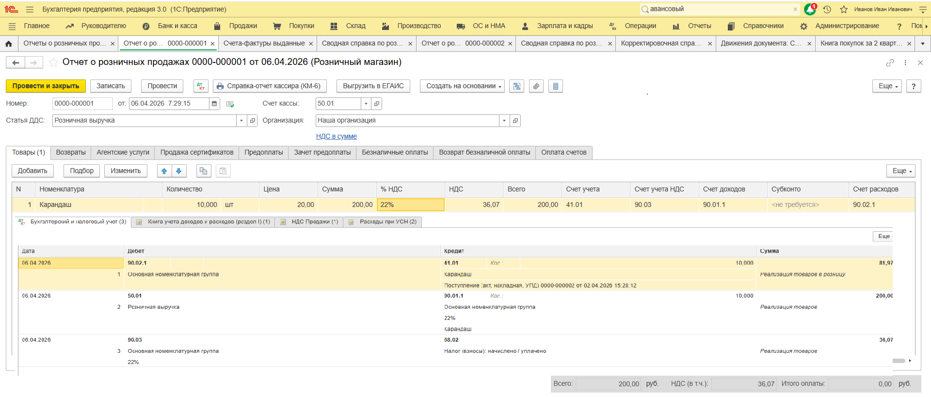 - В программе 1С в группе «Розничные продажи» есть «Отчет о розничных продажах». После проведения этого документа программа формирует проводки.