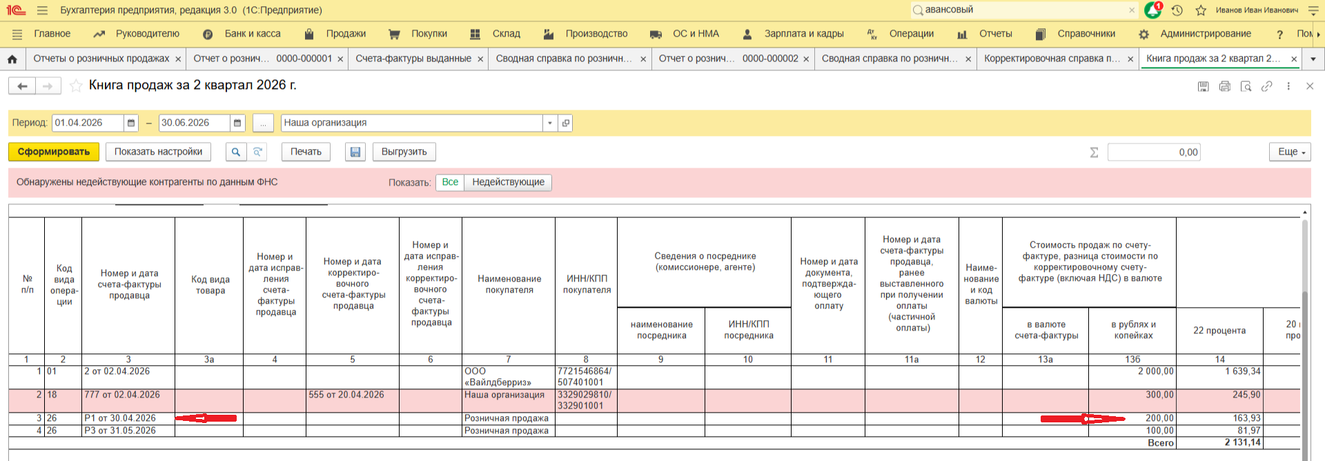 В месяце, когда был возврат, также формируется сводная справка с записью для Книги продаж.