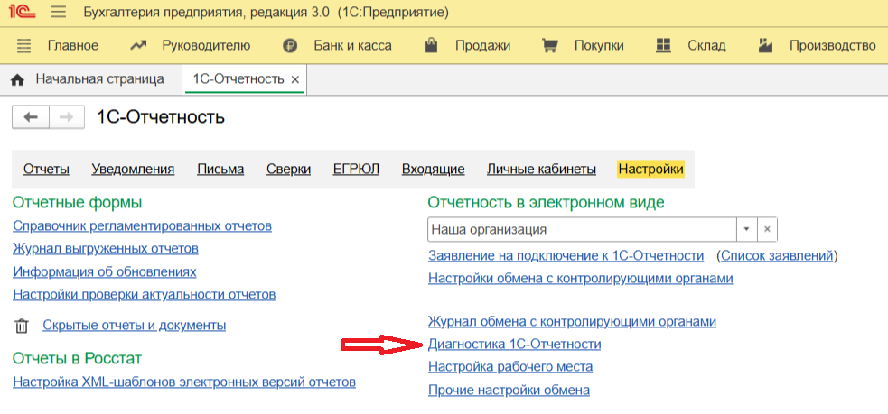 Шаг 2. Сеть и связь с сервером. Часто сервис блокируется антивирусом или офисной системой безопасности. Чтобы исключить этот фактор, воспользуйтесь встроенным инструментом диагностики. В настройках сервиса выберите пункт «Диагностика 1С-Отчетности». Программа автоматически проверит: