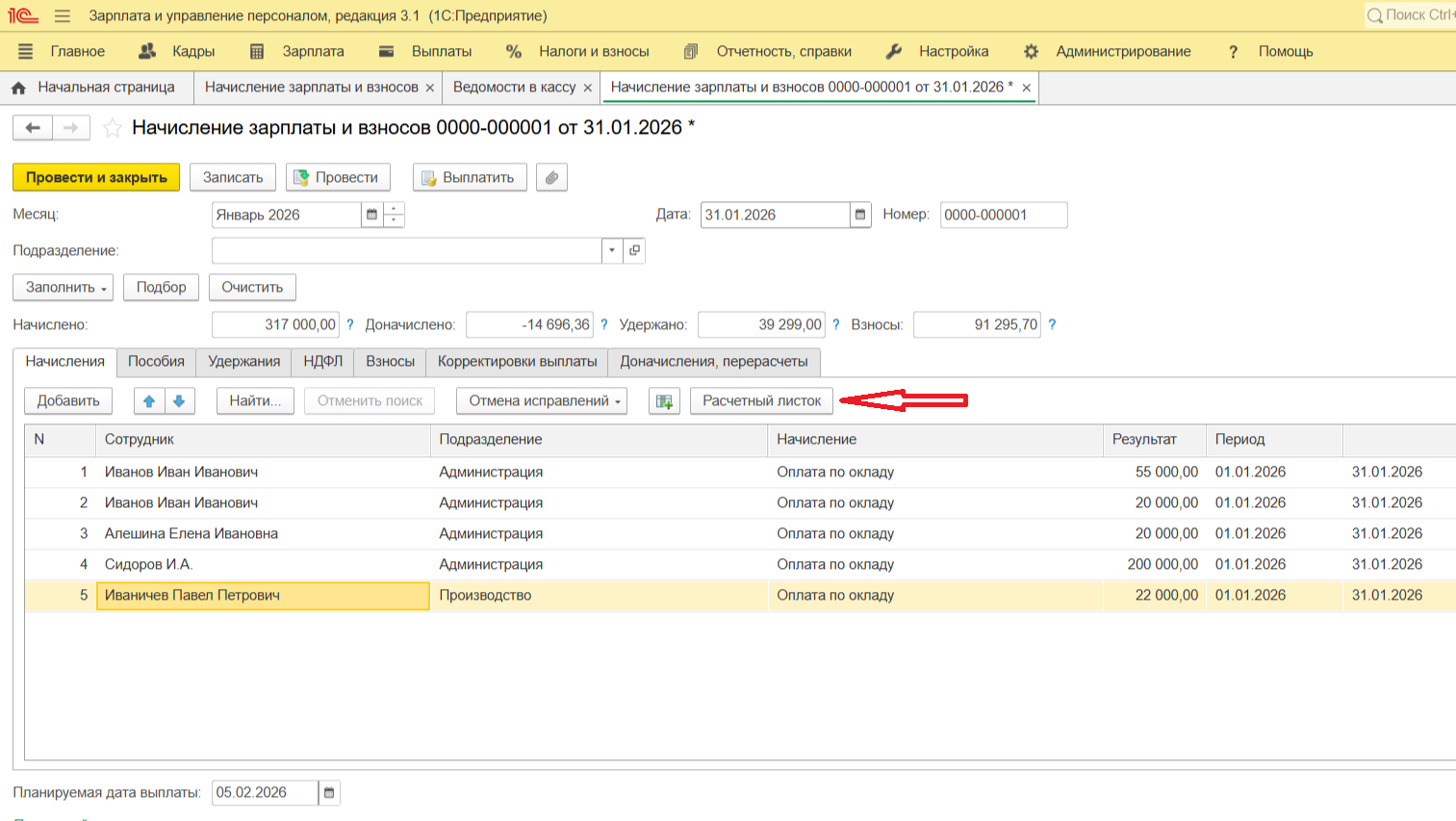 Совпадают ли суммы в «Начислении» и «Ведомости»?