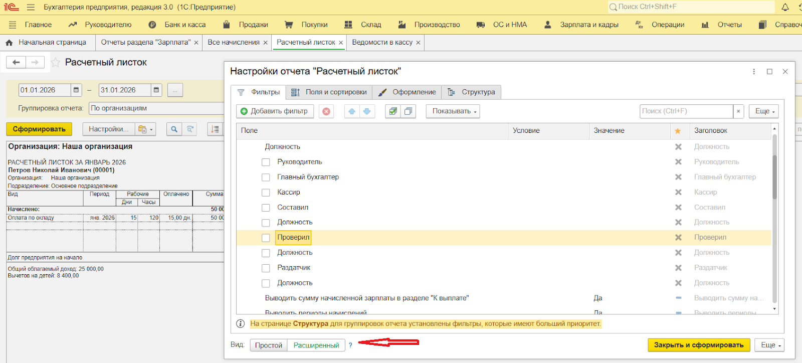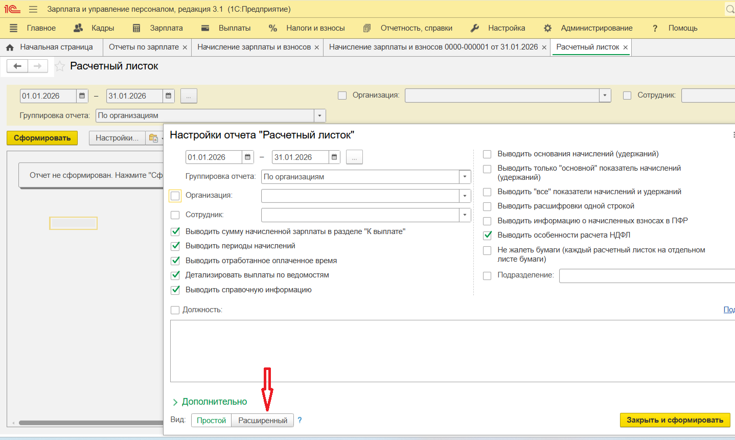 Многие пользователи спрашивают, как в 1С посмотреть расчетный листок, если нужно увидеть данные сразу за квартал или нужно оформление под свои требования? Это делается через кнопку «Настройки», внизу формы вид «Расширенный».