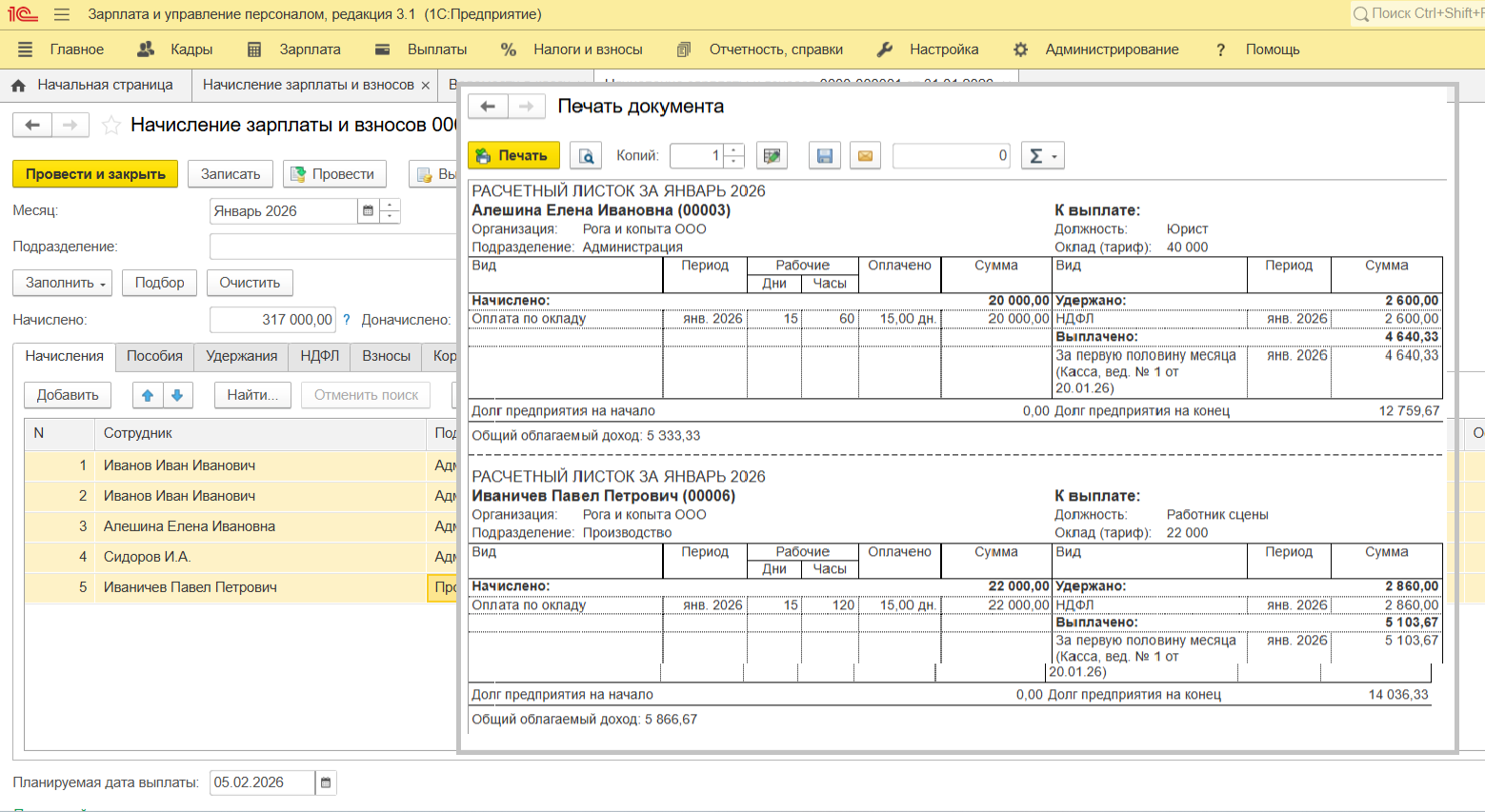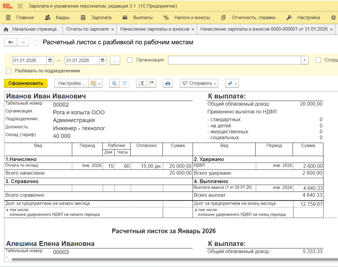 Если сумма «К выплате» не совпадает с вашими ожиданиями, проверьте вкладку «НДФЛ». Часто из-за двойных выплат в одном месяце программа может применить стандартный налоговый вычет дважды или, наоборот, «забыть» его, если доход превысил лимит.
