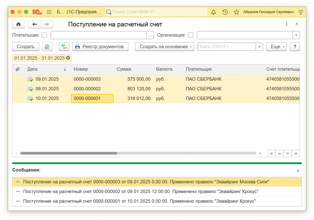 Правила автоматически применяются при загрузке банковской выписки (Загрузка через файл или директ-банк), а также обработка может быть запущена для выбранных документов из формы списка или по кнопке в форме документа.