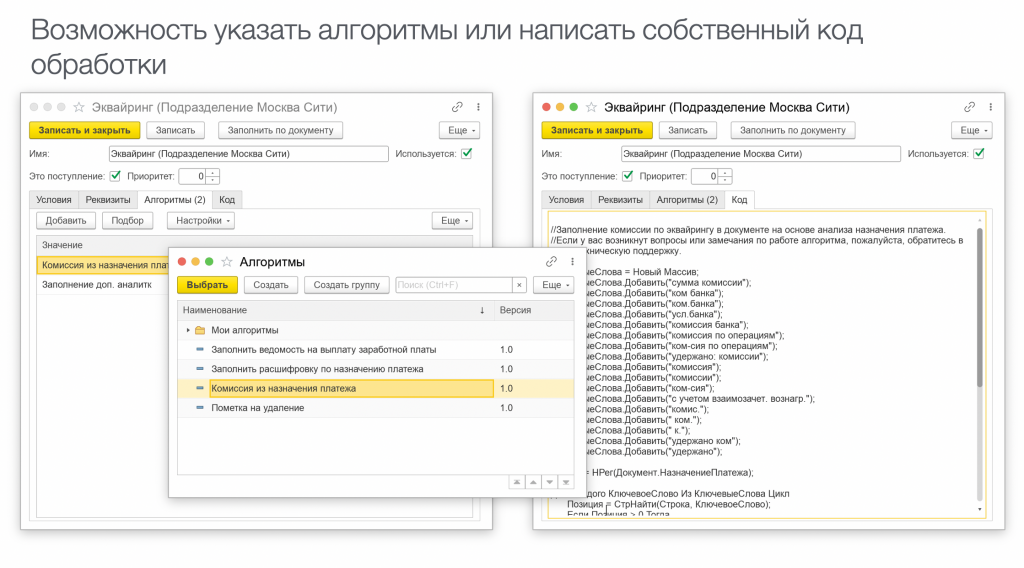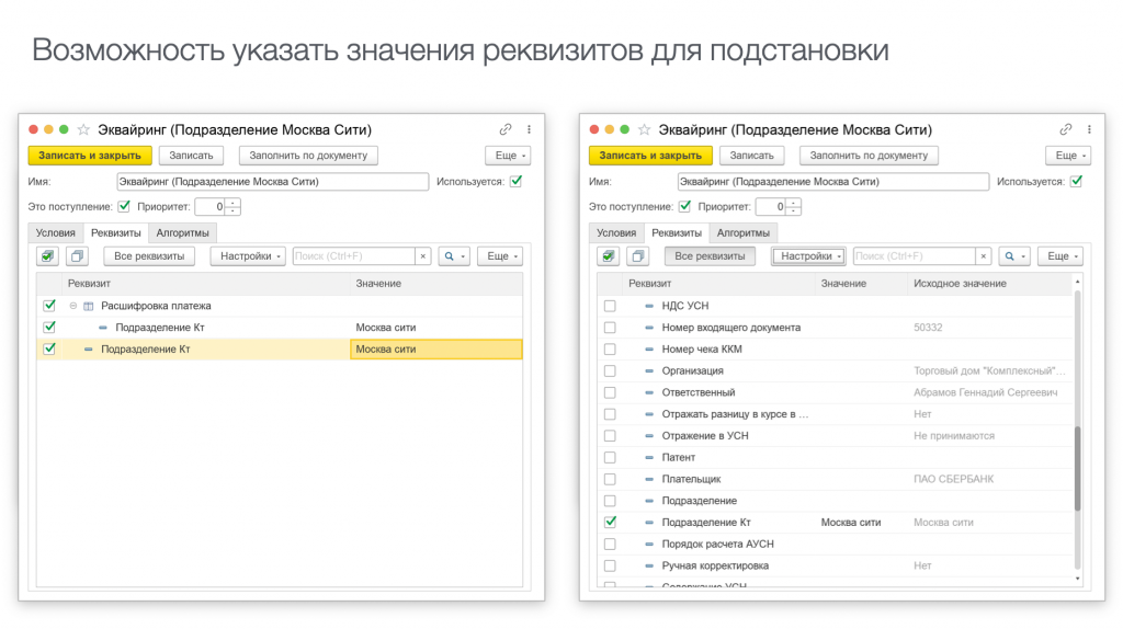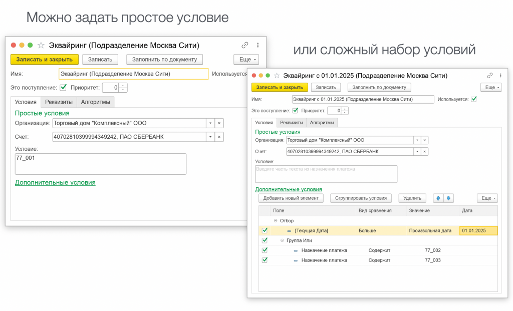 Решение позволяет создать правила для заполнения документов поступления и списания денежных средств.