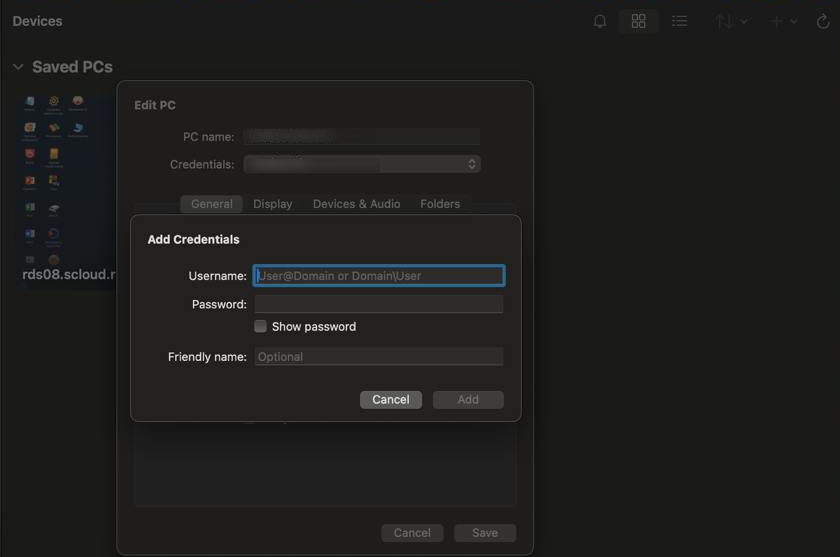 - В поле PC name введите адрес сервера: rds08.scloud.ru