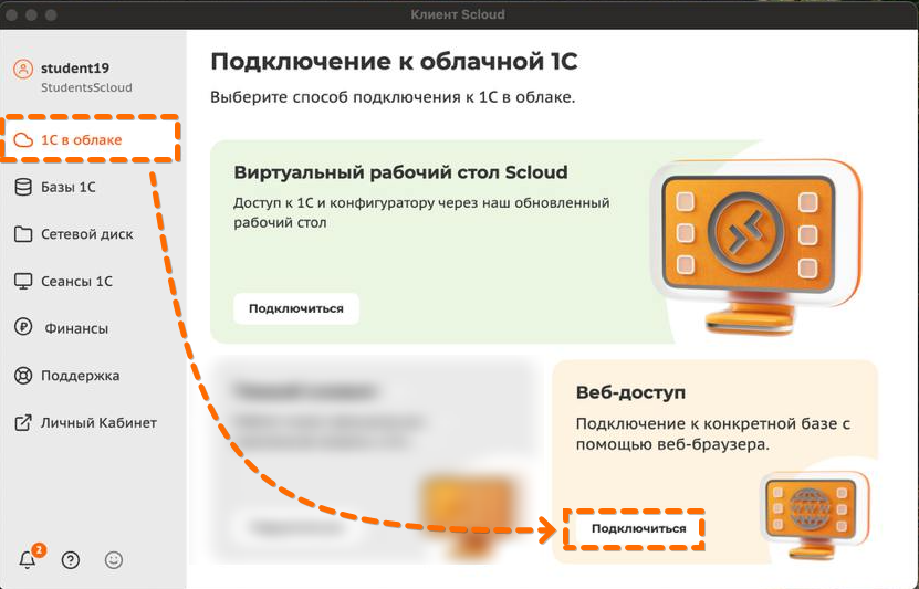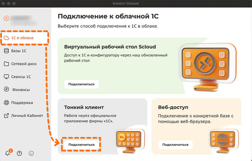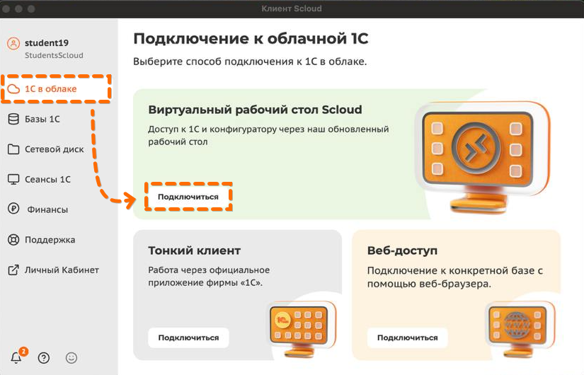Выберите в главном меню приложения Scloud тип подключения «Виртуальный рабочий стол Scloud» и нажмите на него.