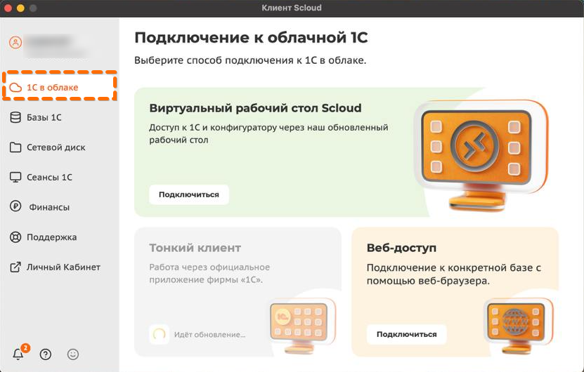 При данном типе подключения вы получите доступ к полноценному рабочему столу Windows-сервера с установленной 1С, включая программу «Конфигуратор» и «Обновления 1С». На удаленном рабочем столе будут отображены ваши локальные диски Mac для удобного обмена файлами, а также будет доступен облачный диск W с базами данных.