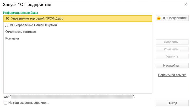Если баз две и более, запустится стандартное окно «1С:Предприятие» с перечнем доступных баз для выбора.