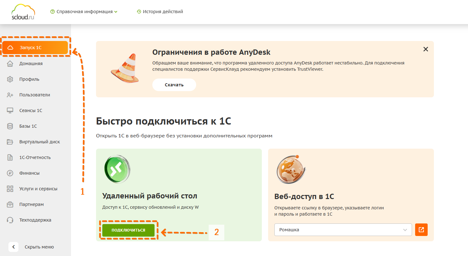 Вариант 2. Другой способ — зайти в личный кабинет scloud.ru в раздел "Запуск 1С" и нажать кнопку "Подключиться".