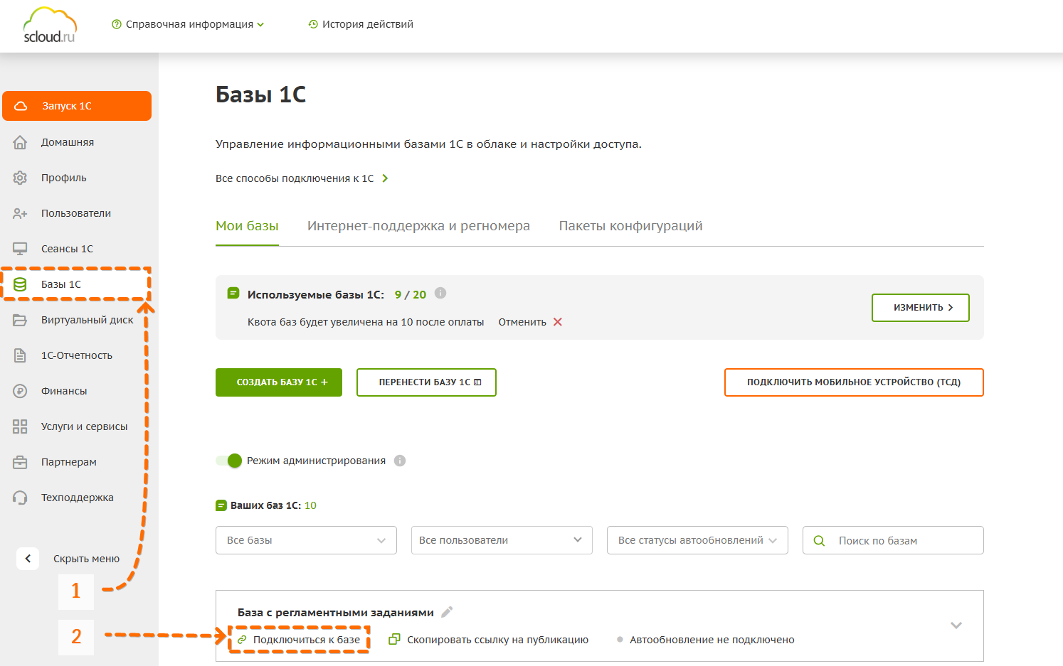 Вариант 1. Для подключения к базе 1С через браузер зайдите в личный кабинет scloud.ru, перейдите в раздел «Базы 1С» и нажмите кнопку "Подключиться к базе"