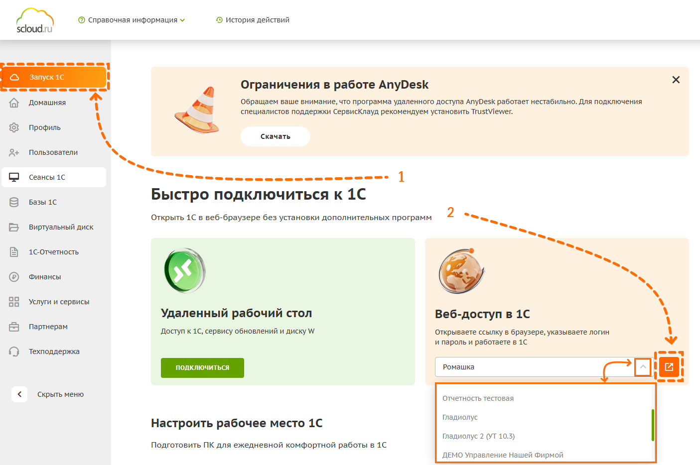Запуск 1С через приложение Scloud.ru