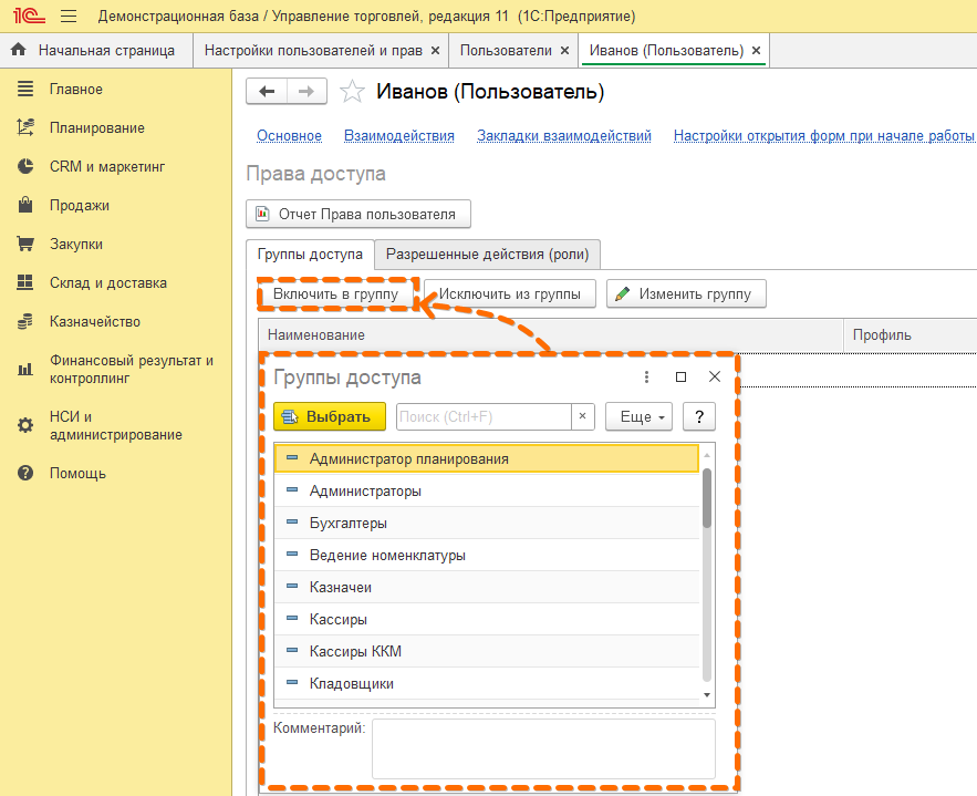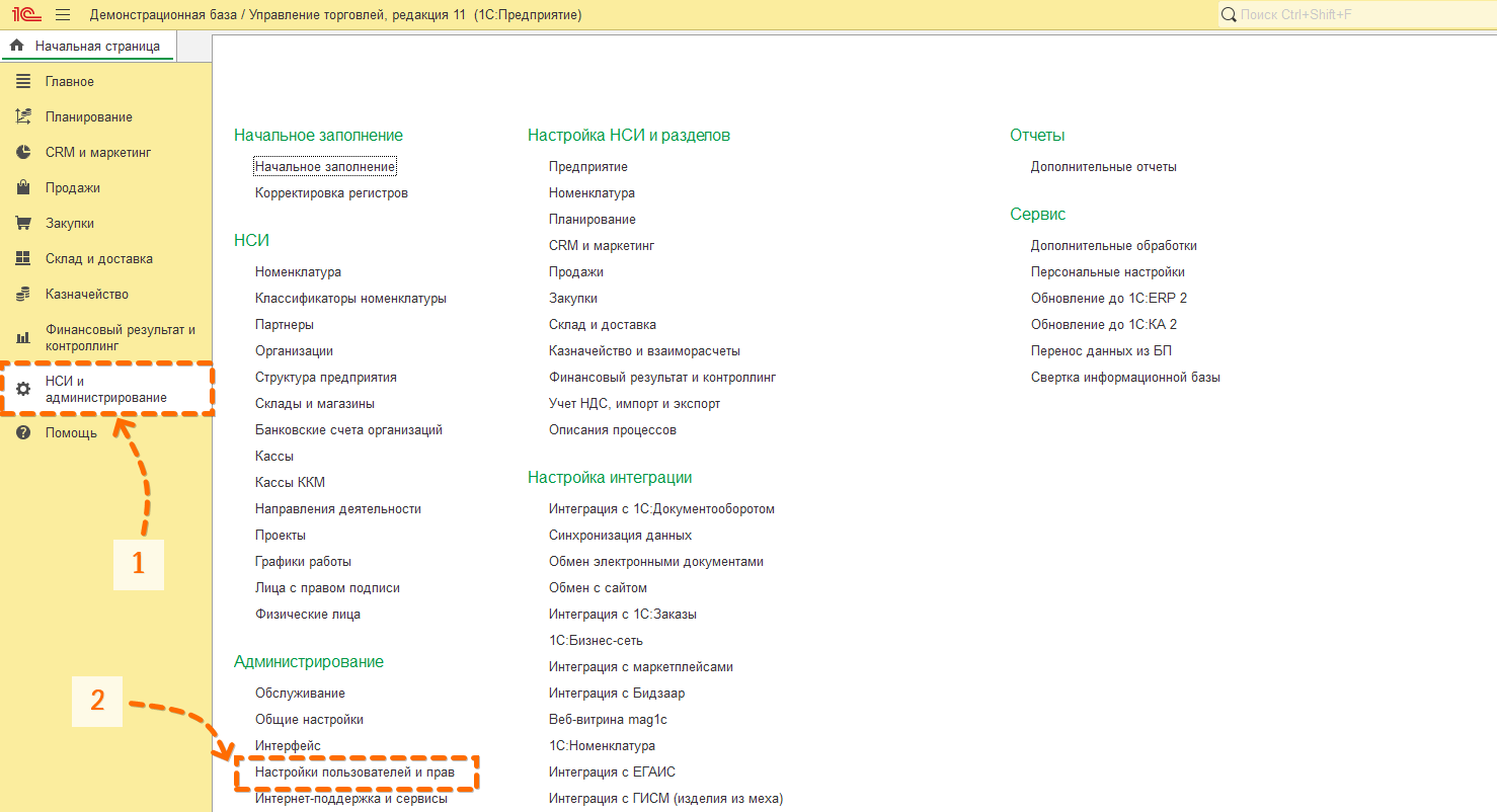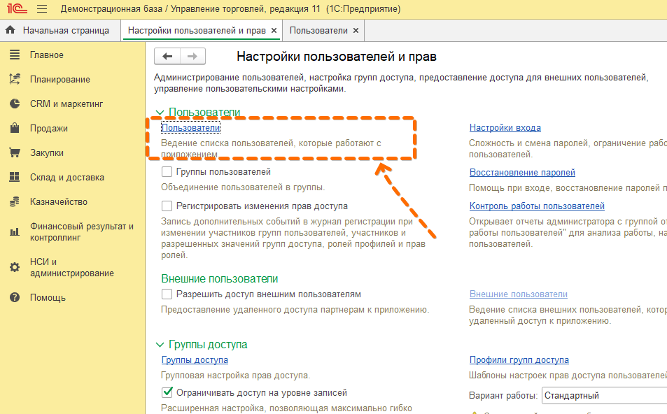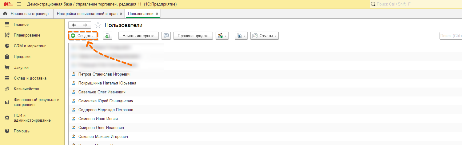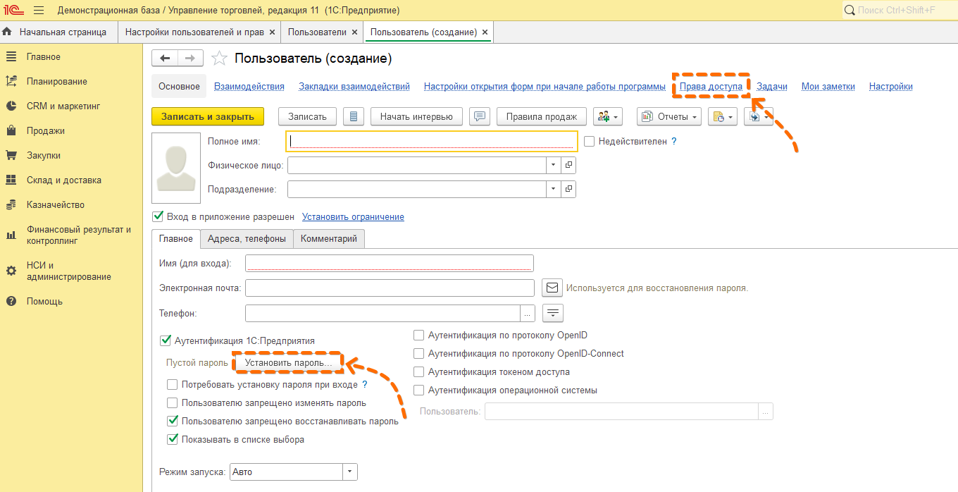 Как создать дополнительного пользователя в программе 1С: Управление торговлей 11, установить пароль, ограничить права доступа: