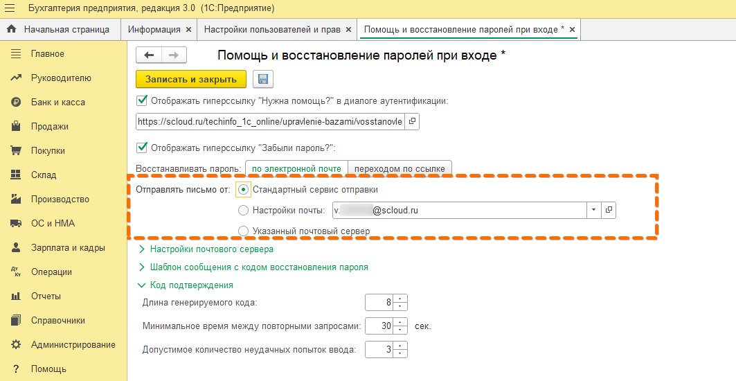 - Настройки почты – используется корпоративный ящик (например, help@scloud.ru). Письма о восстановлении пароля будут отправляться с этого почтового ящика