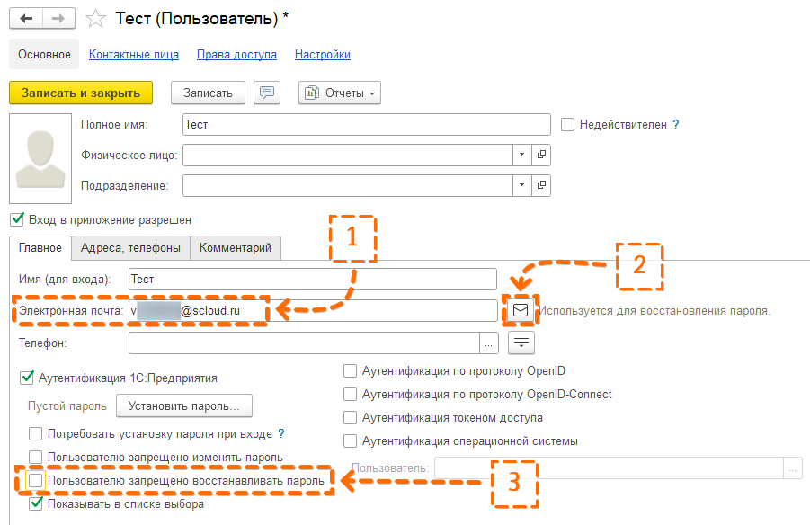 - Убедитесь, что снят флаг "Пользователю запрещено восстанавливать пароль"